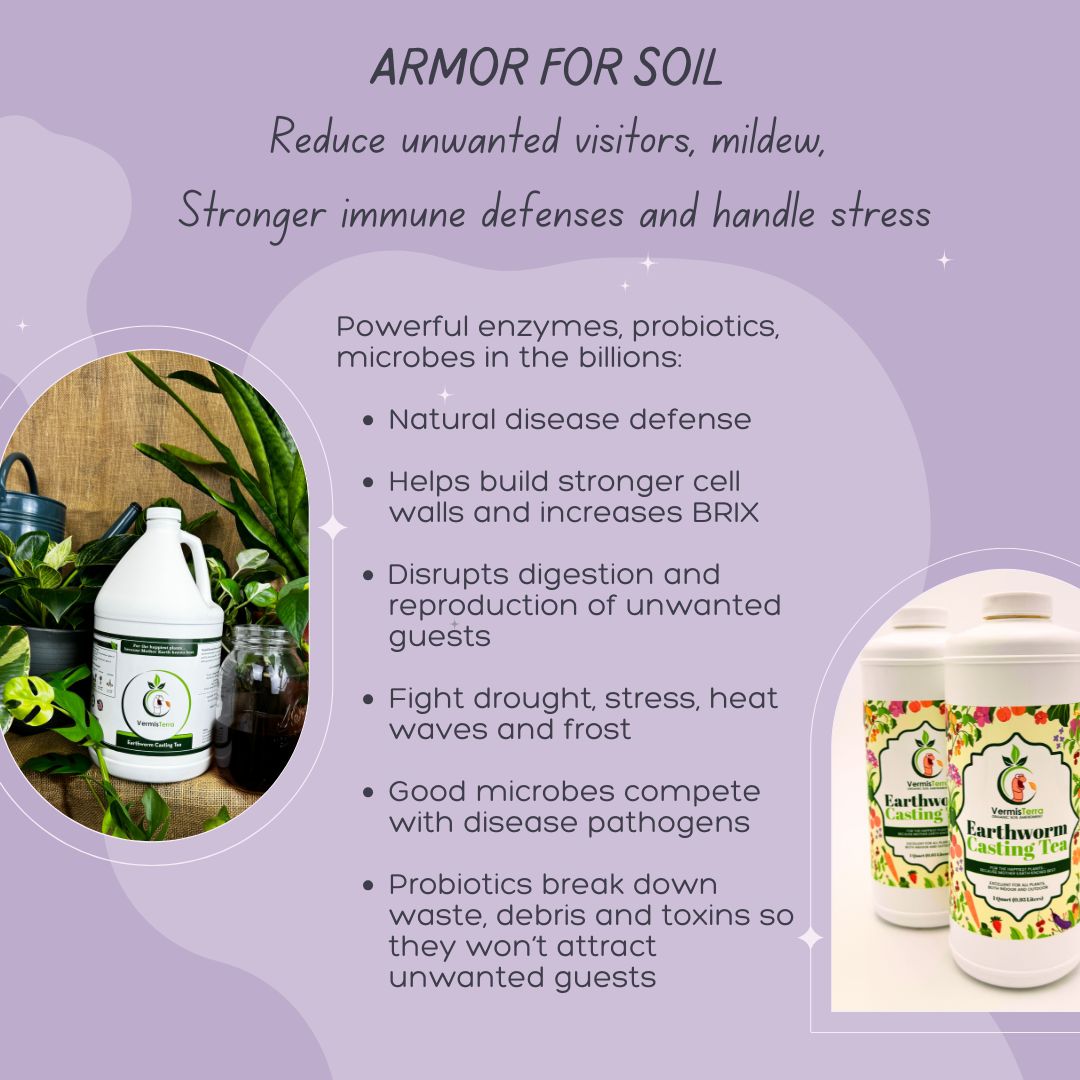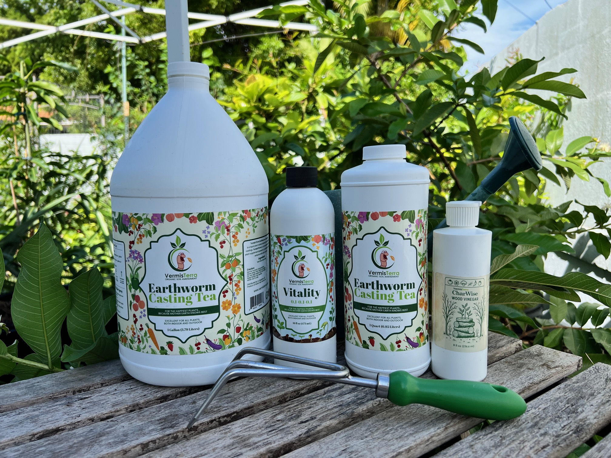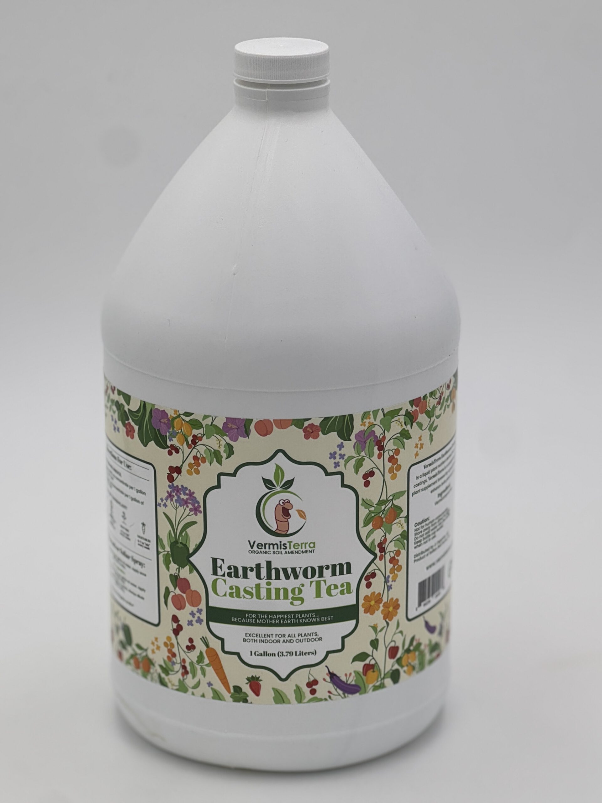 VermisTerra® Earthworm Casting Tea is an all natural and organic microbial solution prepared by a proprietary technique.  It is an excellent fertilizer that help increase the ecological diversity and vitality of the soil.  As a byproduct of vermicompost, it contains all the benefits of earthworm castings and more.  Viable plant health and production rely on their relationship with beneficial microbes the tea provides.  Applying our high-quality Earthworm Casting Tea will make your plants more vigorous and healthy.