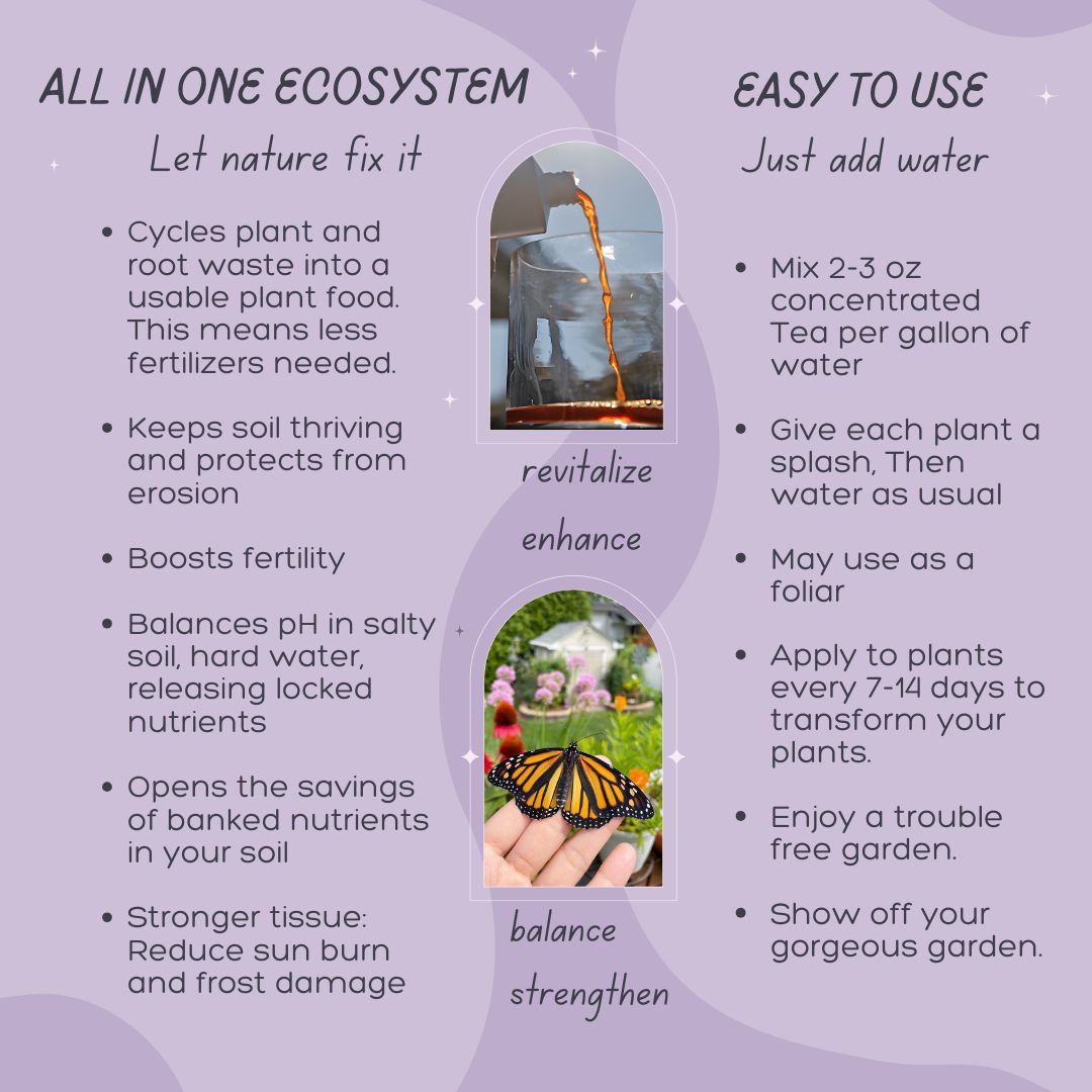 With the Tea providing available nutrients and the microbes enriching the soil, plants will healthy and thrive.